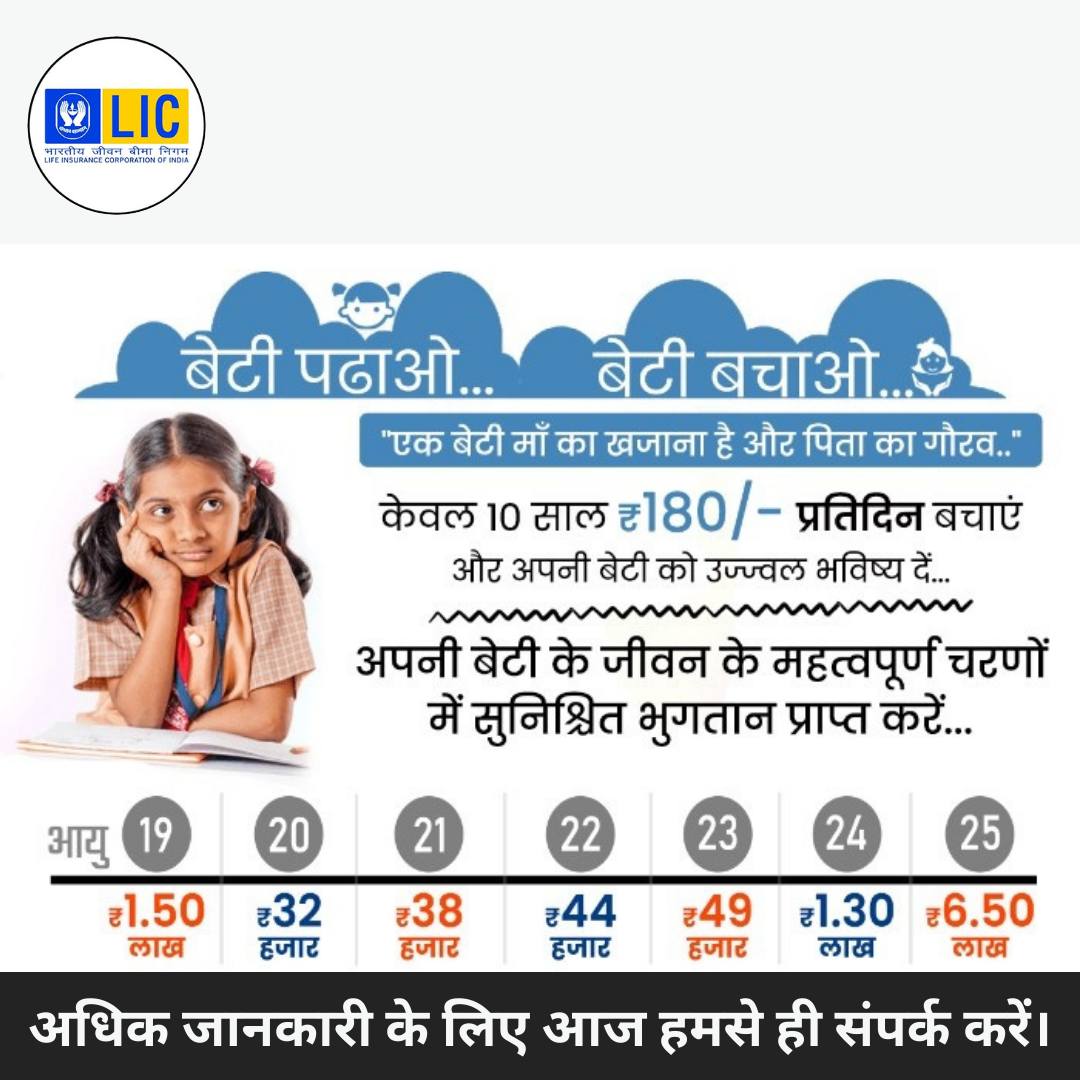 बेटी पढ़ाओ, बेटी बचाओ “एक बेटी माँ का खजाना है और पिता का गौरव केवल ₹180/- प्रतिदिन 10 साल तक बचाएं और अपनी बेटी को उज्ज्वल भविष्य दें।” *महत्वपूर्ण चरणों में सुनिश्चित भुगतान प्राप्त करें: आयु 19: ₹1.50 लाख आयु 20: ₹32 हजार आयु 21: ₹38 हजार आयु 22: ₹44 हजार आयु 23: ₹49 हजार आयु 24: ₹1.30 लाख आयु 25: ₹6.50 लाख *बेटी के हर सपने को साकार करें!
